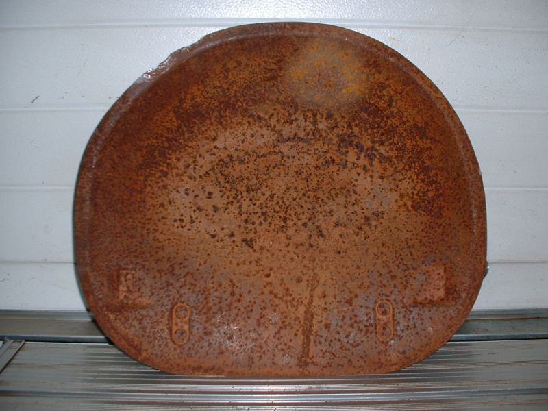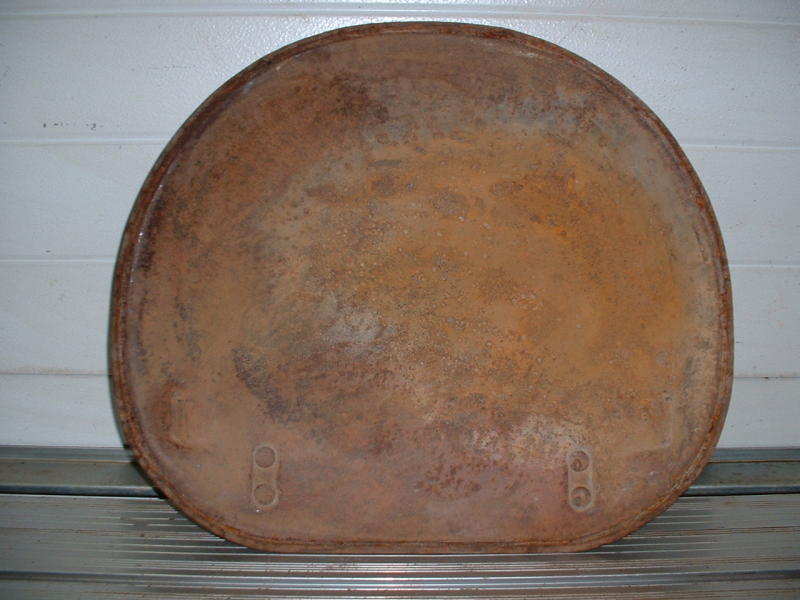 Early Farmall A and B seat pan with the flat edge instead of the later rolled or beaded edge. Seat pan is solid but had damage as shown that the previous owner worked to straighten, $150.00