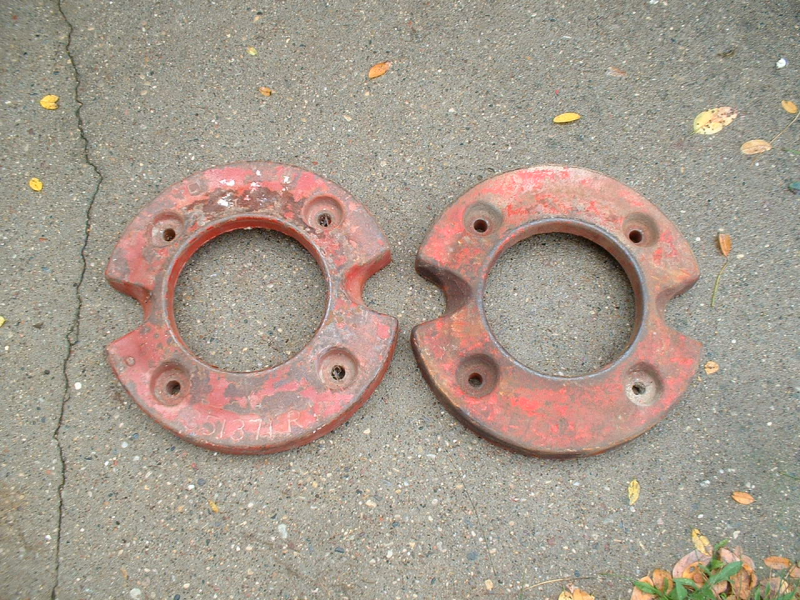 IH 370685R1 front wheel weights fitting all the Farmall and IH tractors with pressed steel front rims, $200.00 for the pair