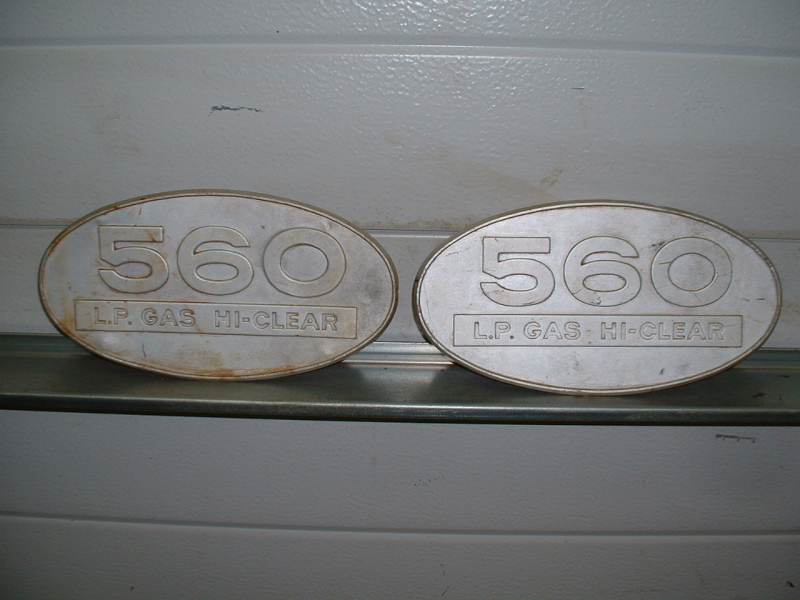 Pair of Farmall 560 LP Gas Hi-Clear emblems in restorable condition with all mounting pins present, $300.00